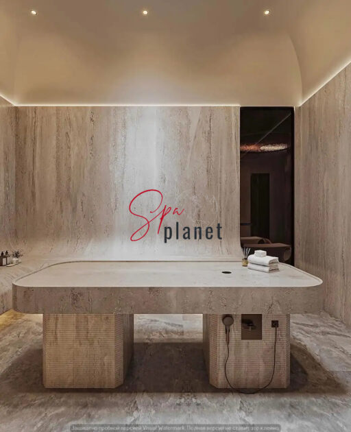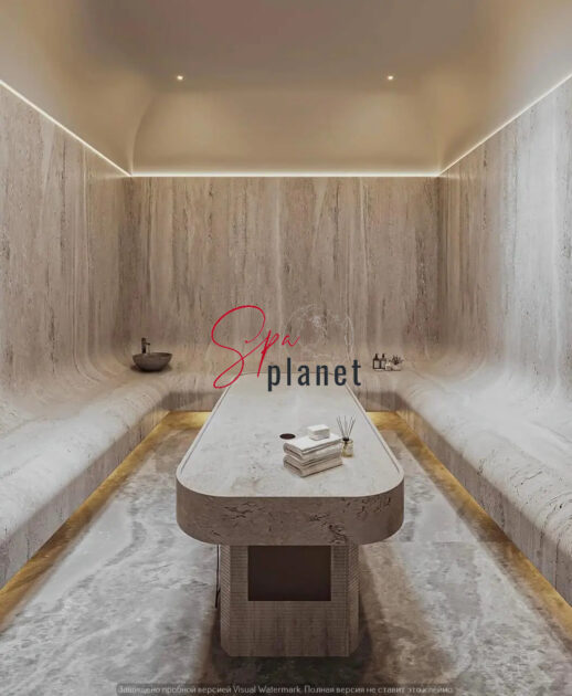 Элегантный хамам в современном исполнении, созданный из натурального камня с мягкой подсветкой, подчеркивающей премиальный дизайн. Пространство сочетает эстетическую простоту и высокую функциональность — здесь каждая деталь продумана для максимального комфорта и восстановления.