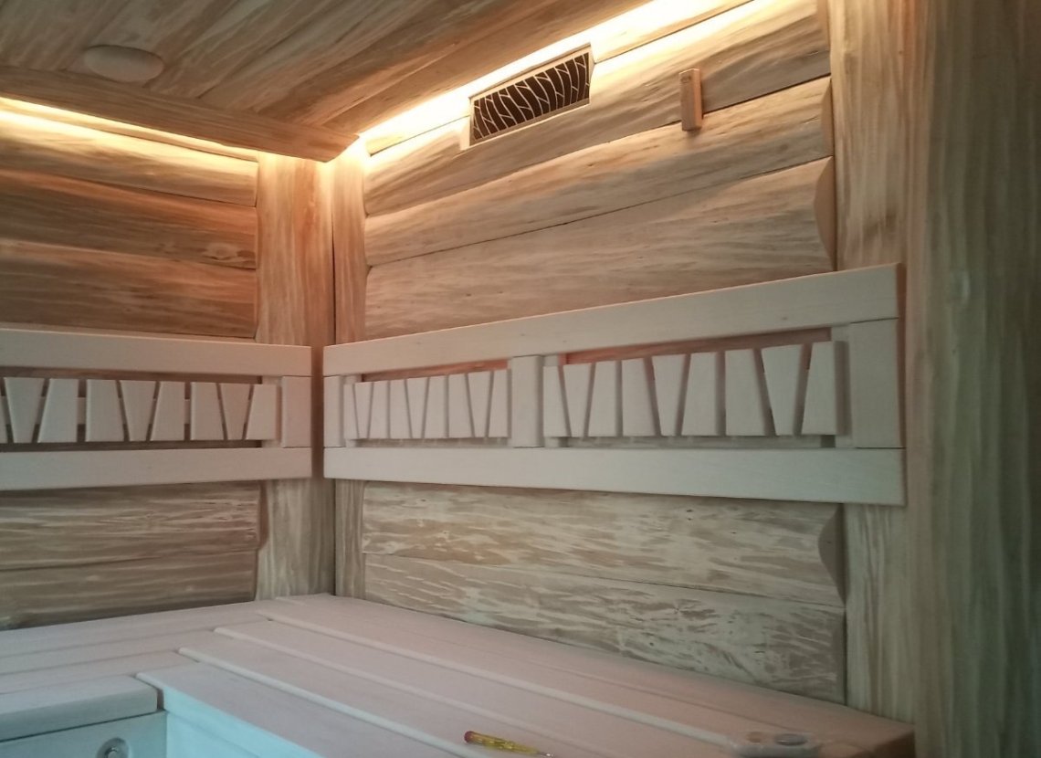The sauna is made of solid wild linden with no bark in a snowless color.