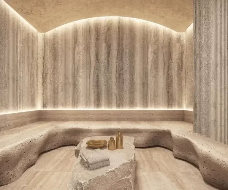 Товсті плити з натурального каменю традиційно використовують для створення лавок, на яких лежать або сидять відвідувачі хамаму. Вони плавно і рівномірно передають тепло, виступаючи у якості посередника між тілом людини і системою обігріву, що знаходиться під ними. Інші поверхні сучасних східних парних оформлюються мозаїкою.
