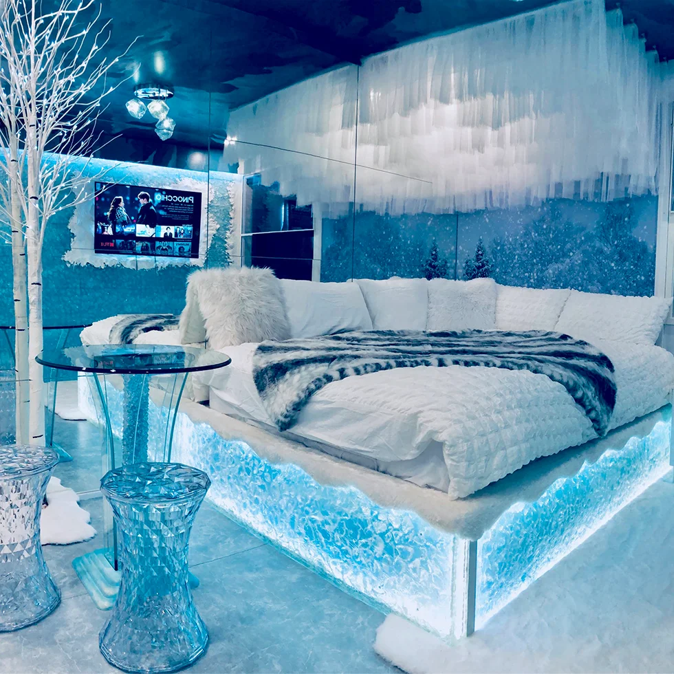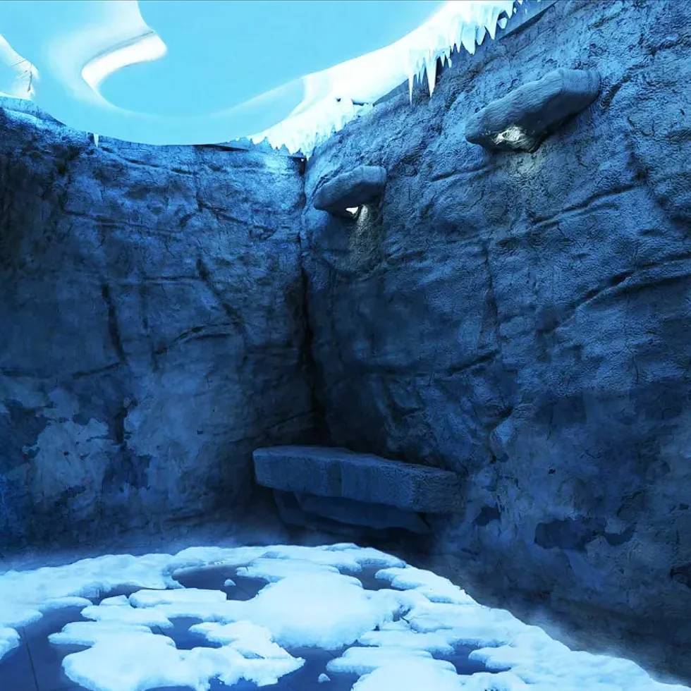 Дизайн Снігової кімнати може бути виконаний в різних стильових напрямках. Особливою популярністю користується оформлення у вигляді гірської печери, де натуральний камінь поєднується з ефектною підсвічуванням, що створює атмосферу справжнього крижаного грота.